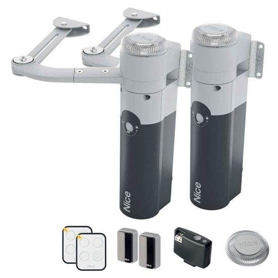 Nice WALKY2024BDKCE este un kit de automatizare pentru porti batante cu doua canaturi de max. 1.8 metri sau 180 kg pe canat cu motoreductor electromecanic ireversibil 24 Vdc, cu braţ articulat.