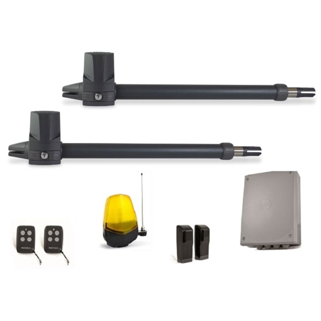 Kit automatizari porti batante 2x3.5m, format din unitate de control, doua actuatoare 230VAC, lampa semnalizare, set fotocelule si doua telecomenzi. Greutate maxima poarta 250kg.
